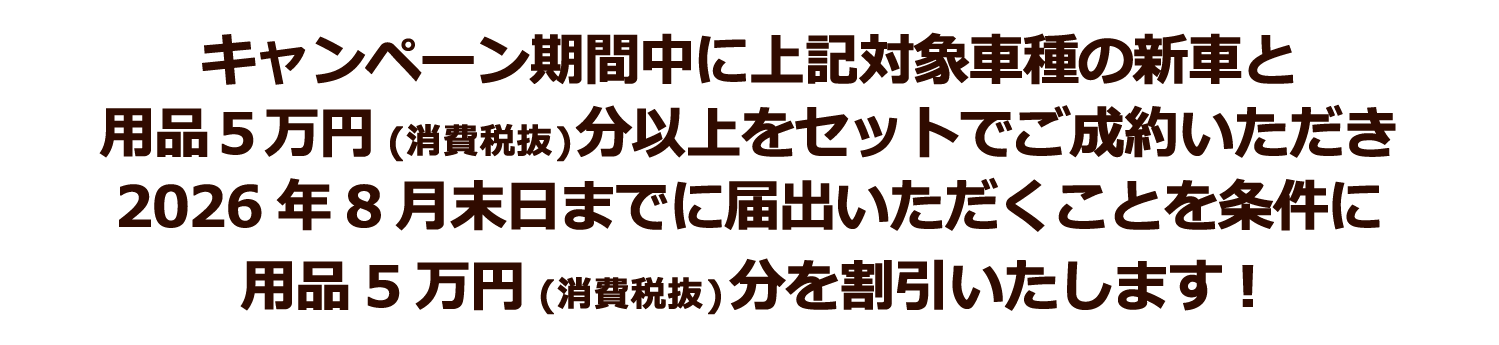 ■2026年4月1日~6月30日までに、ダイハツポート会員にご登録いただけるお客様、又は当社に入庫いただいており、既にダイハツポート会員のお客様を対象として、タント・タント ファンクロス・ムーヴ・ムーヴ キャンバスの新車と用品55,000円(消費税込み)分以上をセットでご成約の上、2026年8月末日までに届出いただくことを条件に55,000円(消費税込み)を割引いたします。■新車と同時にご注文いただいた用品の金額が55,000円(消費税込み)に満たない場合は対象外となります。■他のキャンペーンや割引との併用については別途条件があります。■既に成約済みの車両にさかのぼって適用することはできません。■販売会社によって、期間・内容・条件・対象用品が異なる場合がございます。■一部の店舗では実施していない場合がございます。■営業日は店舗によって異なります。■詳しくは販売会社スタッフへお問い合わせください。■ダイハツショップ・販売店では条件が異なります。詳しくは、ダイハツショップ・販売店におたずねください。