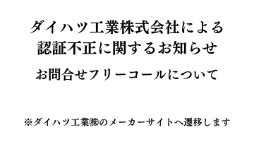 ダイハツ工業株式会社による認証不正に関するお知らせ 「お問合せフリーコール」について ※ダイハツ工業(株)のメーカーサイトへ遷移します