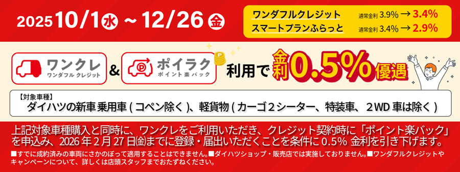 ●対象の新車/中古車を購入する際に、トヨタファイナンス(株)の対象クレジットをご利用いただき、クレジットご契約時に「ポイント楽バック申込書」へご記入いただくこと。 ●トヨタファイナンス(株)のクレジットで、契約期間1年以上の契約が対象です。 ワンダフルクレジット・ワンダフルツイン・ダイハツクレジット(通常)いずれも対象となります。 ●対象クレジットの契約者は、カード会員本人様、または同居のご家族様に限ります。 |