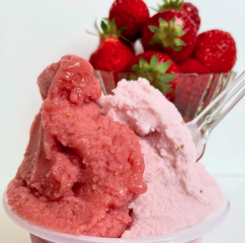 アラモード・キムラの看板商品「アラモードアイス」は、創業当初から受け継がれてきたオリジナルレシピで、今も変わらず丁寧に手作りされています。練乳と新鮮な卵を使ったやさしい甘さと、ジェラートとシャーベットの中間のような、さっぱりとした口どけが特徴です。どこか懐かしさを感じるこの味わいは、長年にわたり地元の方々に愛され続けています。