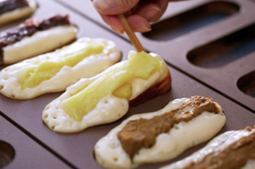 もうひとつの人気商品「アラモード焼」は、創業時から受け継がれる伝統の一品。新鮮な卵をたっぷり使った、ふんわりカステラ状の生地が特徴です。長年の経験で磨かれた絶妙な焼き加減で、外は香ばしく、中はしっとりやわらか。中に詰められた餡やクリームは甘さ控えめで、最後まで飽きずに楽しめる仕上がりになっています。
