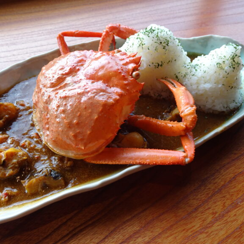 メディアでも紹介された佐渡産紅ズワイガニをふんだんに使った「魚介のカレー」は、一度食べたら忘れられない深い味わい。