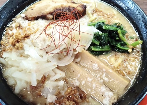 縮れた極太麺に背脂のほどよい甘みが絡み、コク深く旨味たっぷりに仕上がっています。