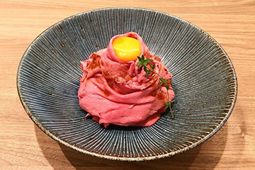 絶品の肉料理と個性が光るスイーツが味わえる「肉とスイーツのお店 koyori」。しっとりと柔らかな食感の自家製ローストビーフをたっぷりのせた「ローストビーフ丼」を召し上がれ。