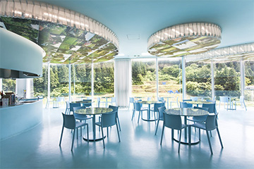 大地の芸術祭拠点施設、まつだい「農舞台」内にある「越後まつだい里山食堂」。目の前に広がる棚田の風景と里山を眺めながら、野菜や山菜などまつだいの“食”が楽しめます。